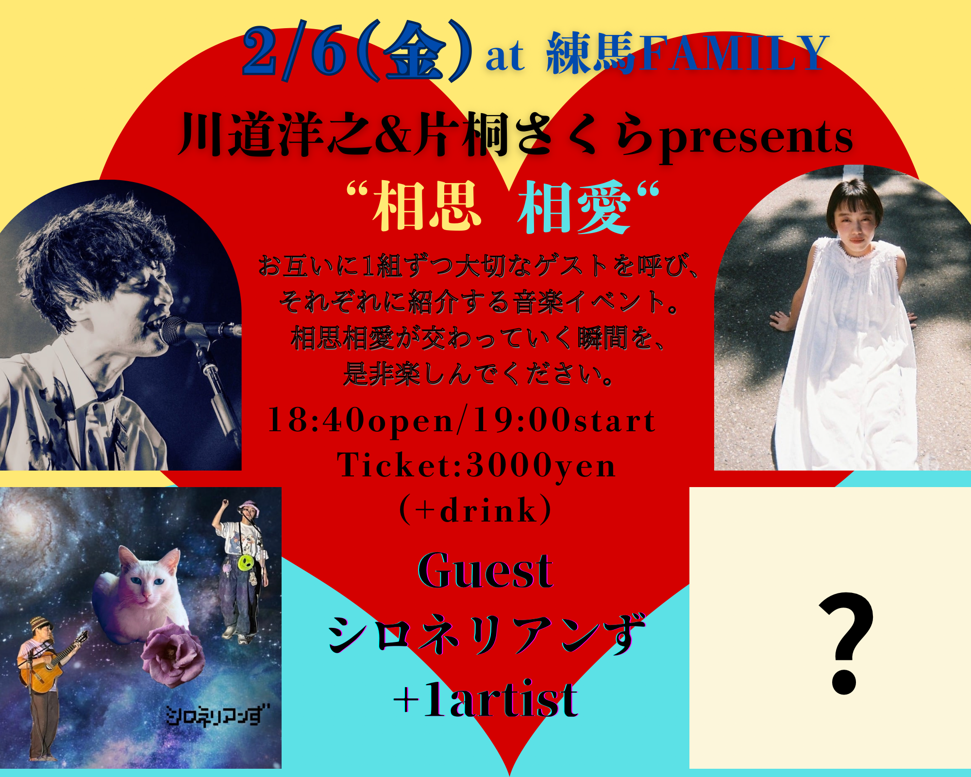 川道洋之&片桐さくらpresents 「相思相愛」 川道洋之/片桐さくら/シロネリアンず and 1artist!
